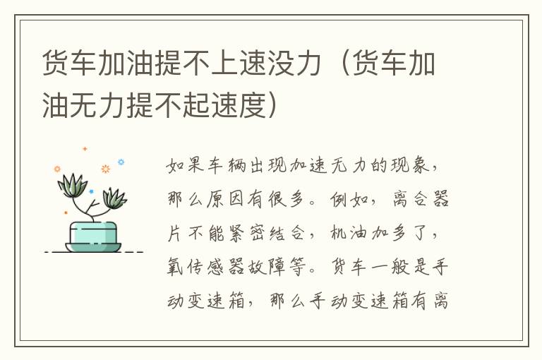 货车一般是手动变速箱,那么手动变速箱有离合器,离合器的压盘固定在发动机飞轮上,离合器片靠压盘压紧后传递动力。如果离合器片不能被压紧,那么在加速时离合器片就会打滑,这样动力就不能完全传递到变速箱上,所以车子加速就会无力。