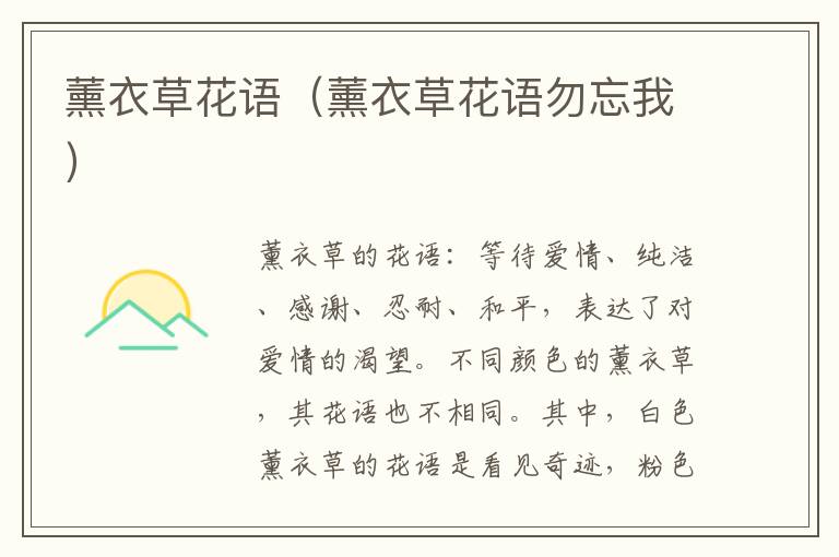 薰衣草的花语:等待爱情、纯洁、感谢、忍耐、和平,表达了对爱情的渴望。不同颜色的薰衣草,其花语也不相同。其中,白色薰衣草的花语是看见奇迹,粉色薰衣草的花语是等你爱我,而蓝色薰衣草的花语是心心相印的爱。