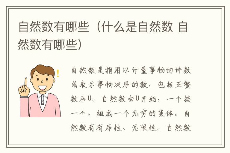 自然数是指用以计量事物的件数或表示事物次序的数,包括正整数和0。自然数由0开始,一个接一个,组成一个无穷的集体。自然数有有序性、无限性。自然数集有加法和乘法运算,两个自然数相加或相乘的结果仍为自然数;也可以作为减法或除法,但相减和相除的结果未必都是自然数,所以减法和除法运算在自然数集中并不是总能成立的。