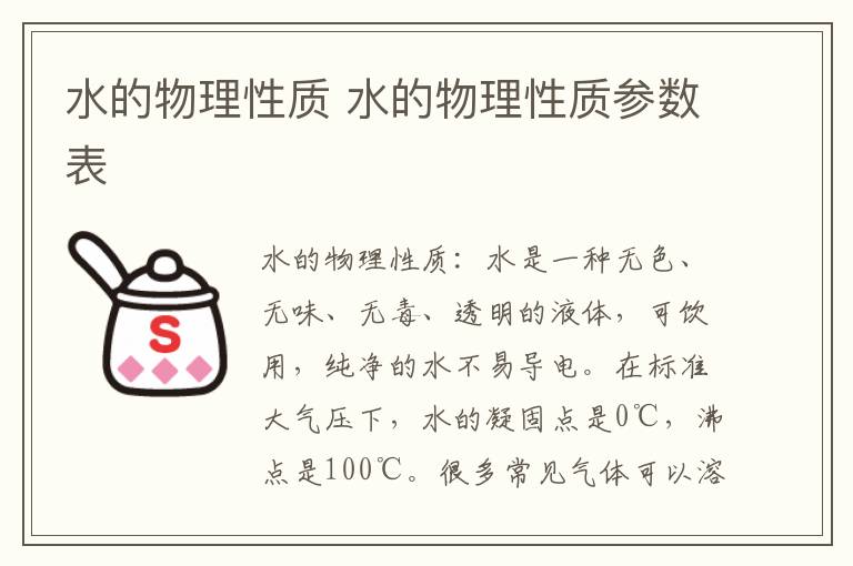 在标准大气压下,水的凝固点是0℃,沸点是100℃。很多常见气体可以溶解在水中,如氢气、氧气、氮气、二氧化碳、惰性气体等。水是地球上最常见的物质之一,是包括人类在内所有生命体生存的重要资源,也是生物体最重要的组成部分。