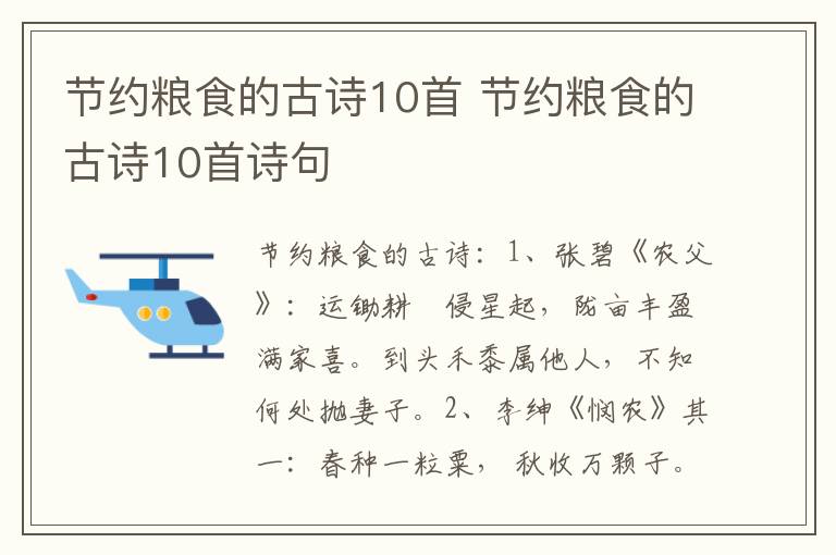 节约粮食的古诗:1、张碧《农父》:运锄耕劚侵星起,陇亩丰盈满家喜。到头禾黍属他人,不知何处抛妻子。2、李绅《悯农》其一:春种一粒粟,