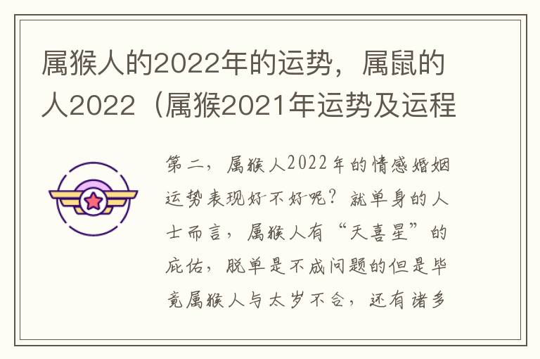 属猴人虽然活泼开朗,但心性浮躁,做事不够认真努力,一旦在运势低迷的年份中,必将会遭受重创而在2022年,对于他们而言是冲太岁的年份,自身各个方面都处于危险的境地中。第二,属猴人2022年的情感婚姻运势表现好不好呢?就单身的人士而言,属猴人有“天喜星”的,脱单是不成问题的但是毕竟属猴人与太岁不合,还有诸多凶星的干扰,属猴人。2022年的属猴人,事业运势起伏不定,尤其对于刚进入职场的新人来说,也许会面临长时间找不到合适工作的情况但即便如此,也不。