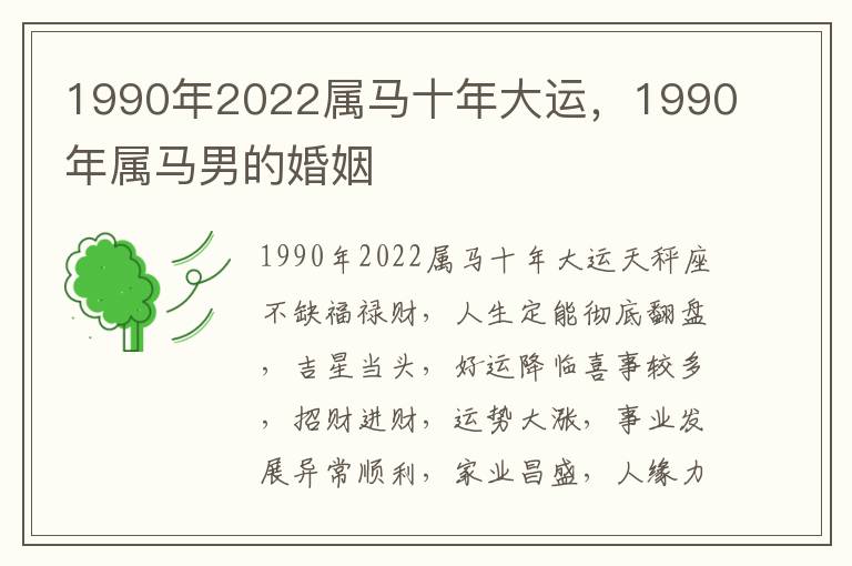 以上就是与1990年2022属马十年大运相关内容,是关于星座的分享。看完1990年属马男的婚姻后,希望这对大家有所帮助!
