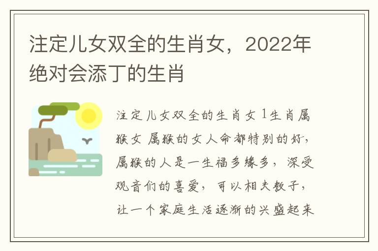 以上就是与注定儿女双全的生肖女相关内容,是关于生肖的分享。看完2022年绝对会添丁的生肖后,希望这对大家有所帮助!