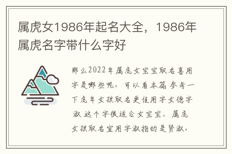 以上就是与属虎女1986年起名大全相关内容,是关于属虎的分享。看完1986年属虎名字带什么字好后,希望这对大家有所帮助!