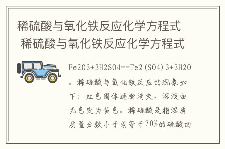 稀硫酸与氧化铁反应化学方程式如下:Fe2O3+3H2SO4==Fe2(SO4)3+3H2O。现象是红色固体逐渐消失,溶液由无色变为黄色。