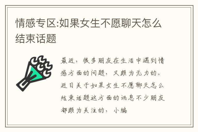 最近,很多朋友在生活中遇到情感方面的问题,又颇为无力的。近日关于如果女生不愿聊天怎么结束话题这方面的讯息不少朋友都颇为关注的,小编今日就如果女生不愿聊天怎么结束话题整理了一些信息,希望对关注这方面信息的朋友有所帮助.
