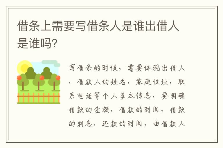借条最好由借款人写,但要注意书写规范。贷款发生的日期,一定要写清楚,最好准确到日,借款金额应同时用数字和中文大写,并写清币种,付款尽量选择银行转账的方式,可以在借条中明确对方收款的账号和转账日期,借条出具后,应同时收取借款人亲笔签名的身份证复印件,如金额较大,可请律师或第三方见证并签字。借款合同应当采用书面形式,但是自然人之间借款另有约定的除外。