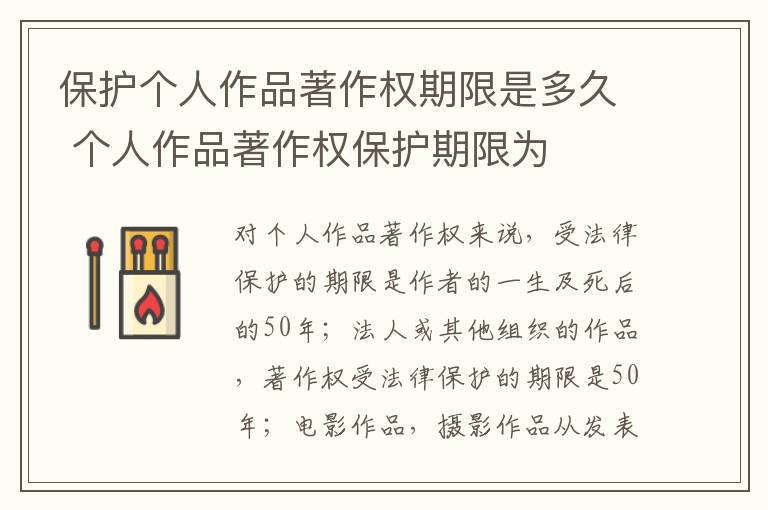 个人作品著作权保护期限是作者一生及死后五十年,取得著作权的方式有两种,一种是原始取得,一种是继受取得,所谓原始取得是指作品完成之后就享有相应的著作权,受法律保护,继受取得是以他人寄存的权利为基础而派生出来的,通过继受取得的著作权是部分有效的。