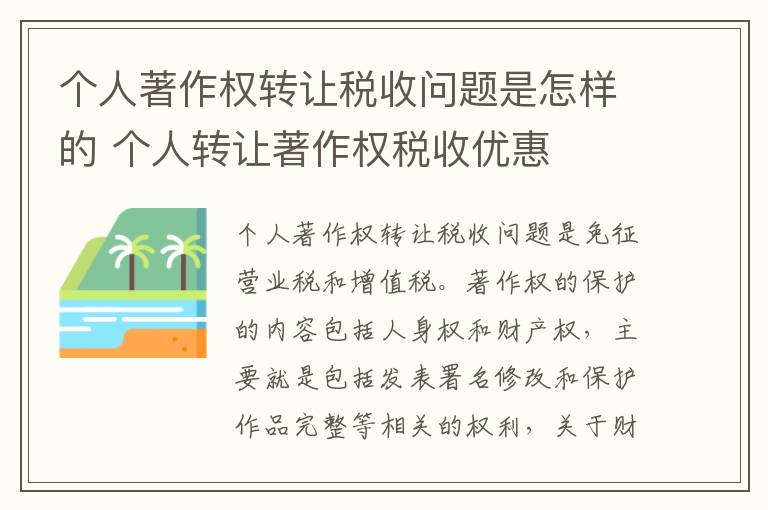 个人著作权转让税收问题是免征营业税和增值税。我国营业税有关法律条例指出转让著作权不需要缴纳营业税以及增值税。