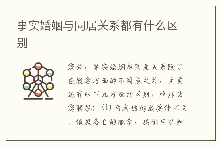 您好,事实婚姻与同居关系除了在概念方面的不同点之外,主要还有以下几方面的区别,律师为您解答: