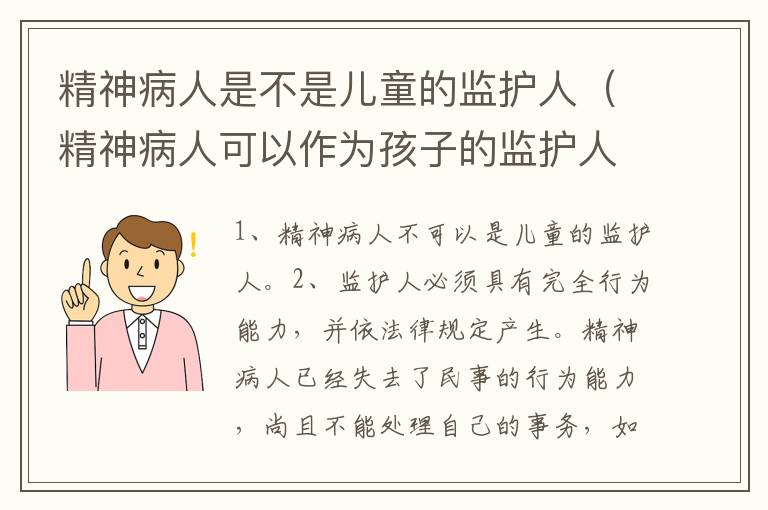 2、监护人必须具有完全行为能力,并依法律规定产生。精神病人已经失去了民事的行为能力,尚且不能处理自己的事务,如果让精神病人担任儿童的监护人,势必会对儿童的权益造成侵害。