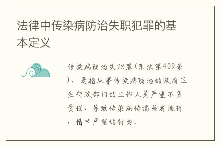 传染病防治失职罪(刑法第409条),是指从事传染病防治的政府卫生行政部门的工作人员严重不负责任、导致传染病传播或者流行,情节严重的行为。