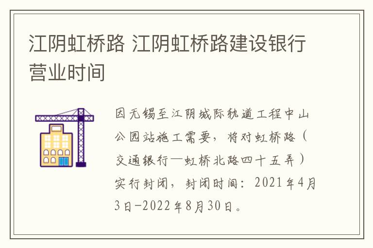 因无锡至江阴城际轨道工程中山公园站施工需要,将对虹桥路(交通银行—虹桥北路四十五弄)实行封闭,封闭时间:2021年4月3日-2022年8月30日。封闭施工期间,封闭路段禁止机动车及非机动车通行。人民中路由西向南往虹桥南路右转弯匝道实行由西向南单向通行。