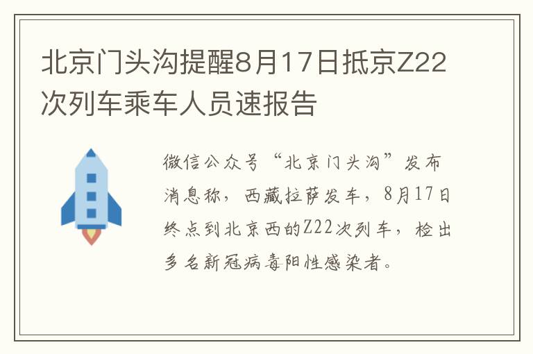 2022年8月15日西藏拉萨发车,8月17日终点到北京西的Z22次列车,在经停石家庄北站下车乘客“落地检”及后续排查检测中,检出多名新冠病毒阳性感染者。