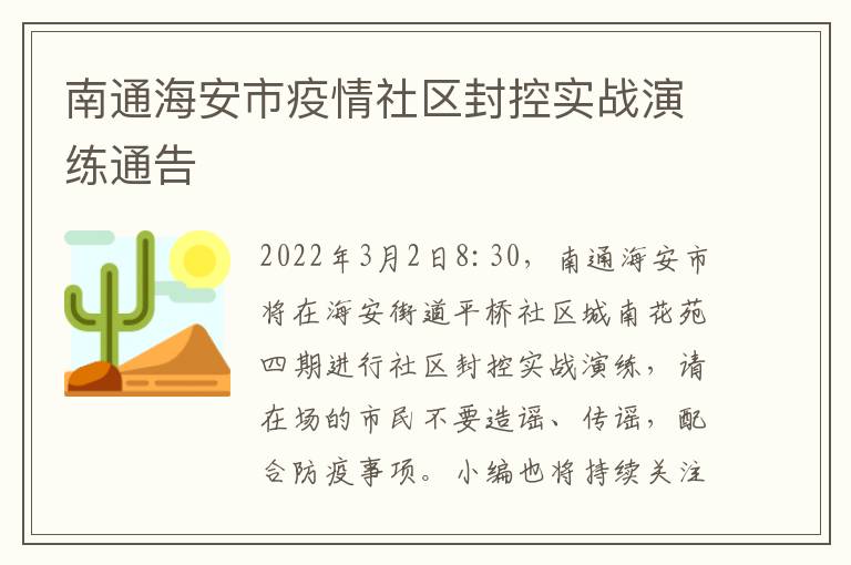 为进一步提升我市新冠肺炎疫情防控应急处置能力,确保快速果断处置可能发生的疫情,保障人民群众生命安全和身体健康,经市新冠肺炎疫情联防联控指挥部研究决定,定于2022年3月2日(星期三)上午8:30在海安街道平桥社区城南花苑四期开展社区封控实战演练,历时半天。