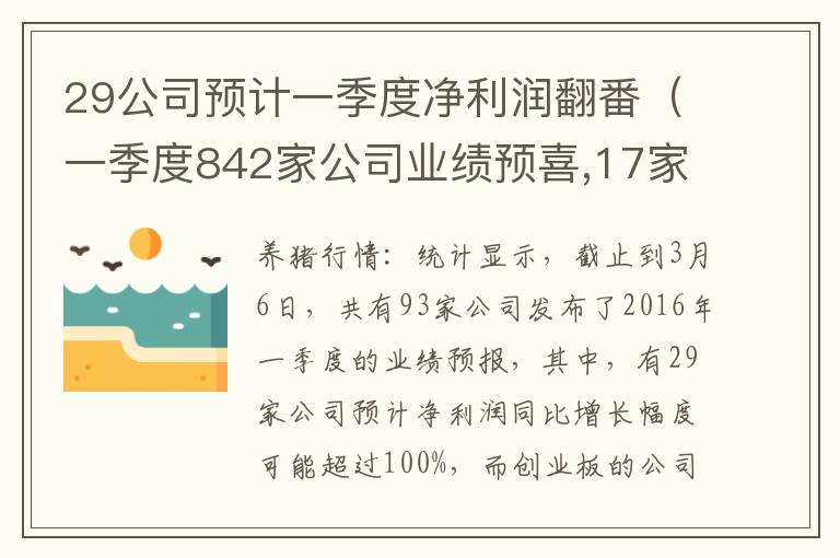 例如,牧原股份预计,2016年一季度的净利润30000万元至35000万元,而上年同期,公司浮现亏损,对于扭亏的缘故,公司的解释是,上述业绩区间的预计,是基于公司对2016年首席季度均匀每头生猪约摸的盈利水平区间的预计,和依据生产准备对2016年首席季度生猪出栏量区间的预计。
