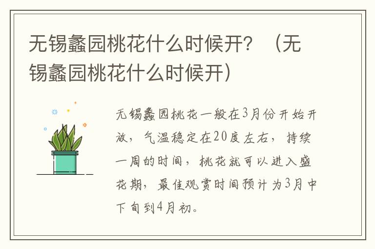 一般在3月中旬开始陆续开放,气温稳定在20度左右,持续一周的时间,桃花就可以进入盛花期,蠡园的桃花一般在三月中下旬开始盛放,可一直持续到四月中旬。